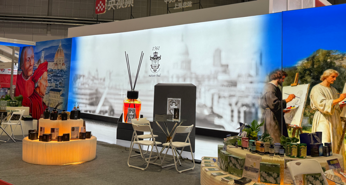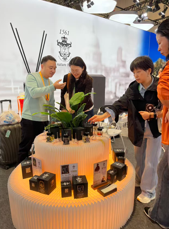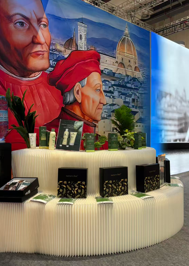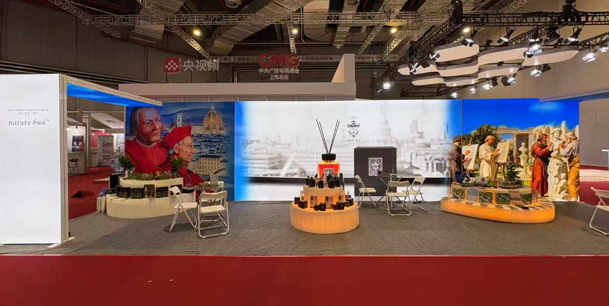 At this year’s CIIE, Nature Bud’s pavilion takes “Florentine Renaissance art” as its core backdrop, recreating the historical context of the Medici family’s “nurturing art with wealth” — the handcrafted aromatherapy containers displayed at the pavilion are all replicas of patterns from the Uffizi Gallery’s collection. Dynamic projection technology real-time demonstrates the “connection between aromatherapy ingredients and Renaissance paintings” (e.g., lemon fragrance echoes the bright tones in Botticelli’s Primavera, while cedar aroma reflects the serene texture in da Vinci’s Lady with an Ermine).